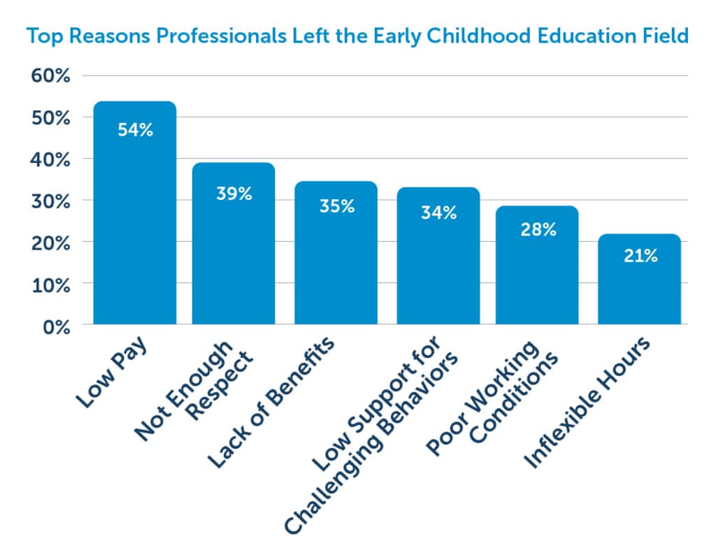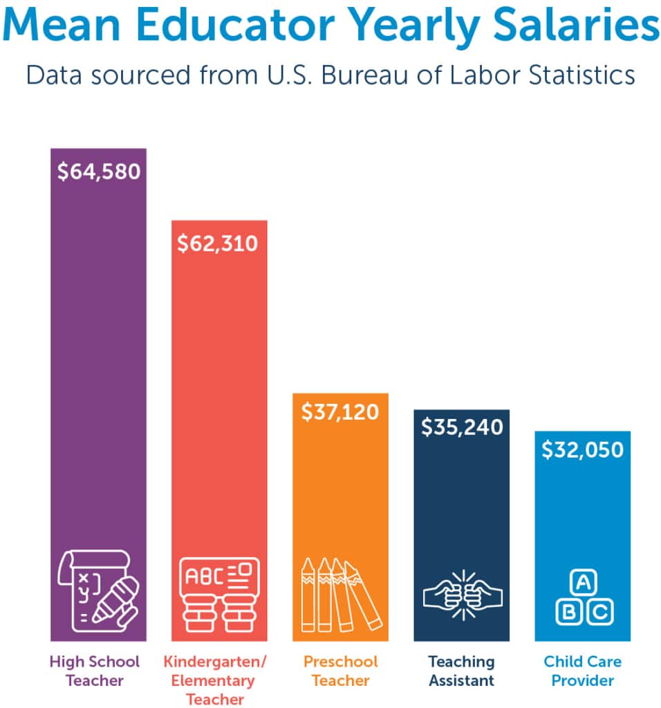 Salaries for early childhood educators are often lower compared to other professions requiring similar levels of education and responsibility. Wage disparities are also driven by race, funding source, and the age of children served.
